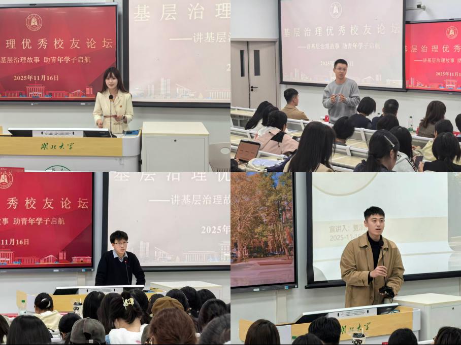 2025年11月16日,湖北大学公共管理学院基层治理优秀校友论坛在长江新区校区举办。2008级校友蔡昌利、2018级校友陈军武、2020级校友贾泽阳等优秀校友重返母校,与2025级行政管理、国际事务与国际关系专业146名学生相聚鄢家湖畔,面对面分享在校记忆与基层工作感悟。学院党委书记唐良敬、党委副书记余欢、行政管理系副主任陈娟、辅导员李鑫泽、陈欣艺参与本次活动。