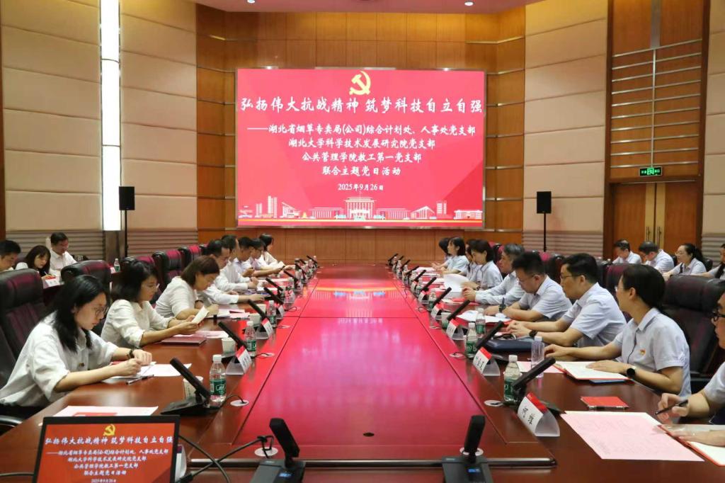 9月26日下午,湖北省烟草专卖局(公司)综合计划处党支部、人事处党支部,湖北大学科学技术发展研究院党支部、公共管理学院教工第一党支部联合开展“弘扬伟大抗战精神 筑梦科技自立自强”主题党日活动。省烟草专卖局(公司)党组成员、副总经理涂凯,湖北大学党委常委、副校长刘志洪,湖北省烟草专卖局(公司)综合计划处党支部、人事处党支部全体党员,湖北大学科学技术发展研究院党支部、公共管理学院教工第一党支部全体党员参加联合主题党日活动。