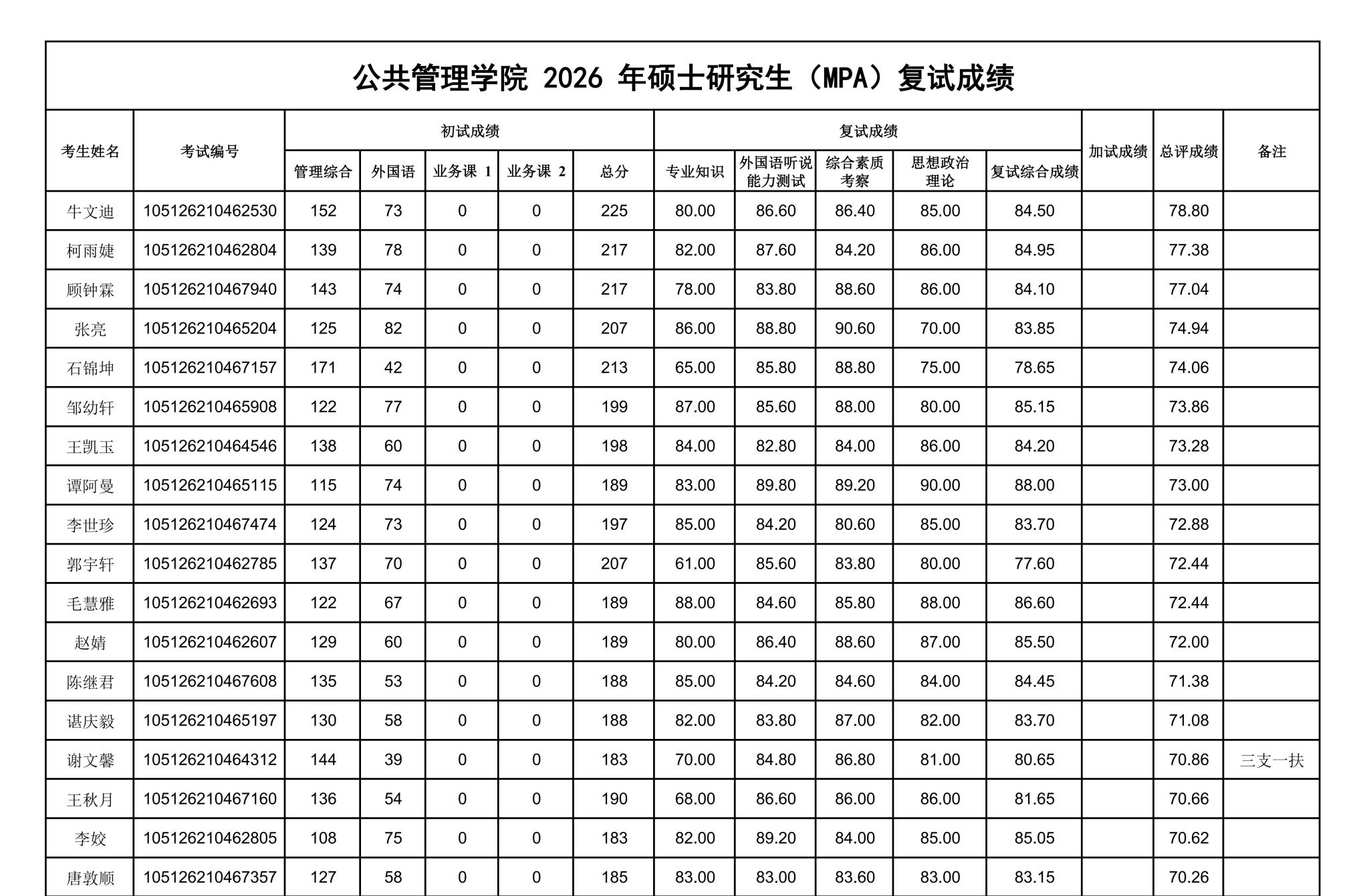 公共管理学院2026年硕士研究生(MPA)复试成绩公示
